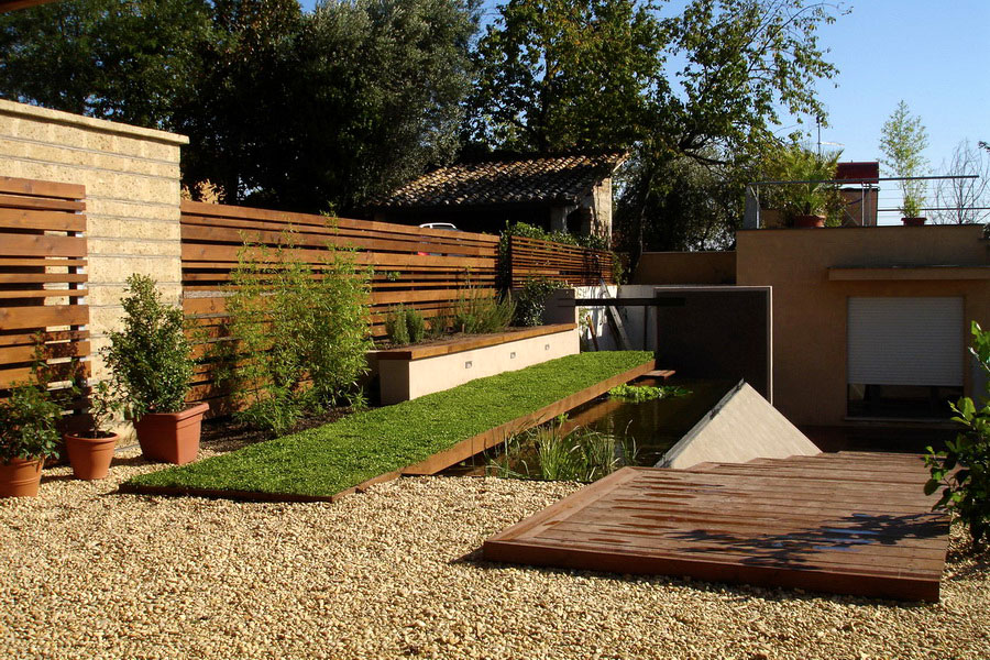 La scelta di inserire un bio lago scaturisce da una doppia esigenza : da un lato la necessità di introdurre un componente che avesse una funzione mitigatrice del microclima-giardino; dall’altro la voglia di inserire un elemento naturalistico ,utilizzato anche come piscina, un “giardino d’acqua” in cui si ricrea un miniecosistema vivo e pulsante che aggiunge valore ad un design rigoroso ed elegante.